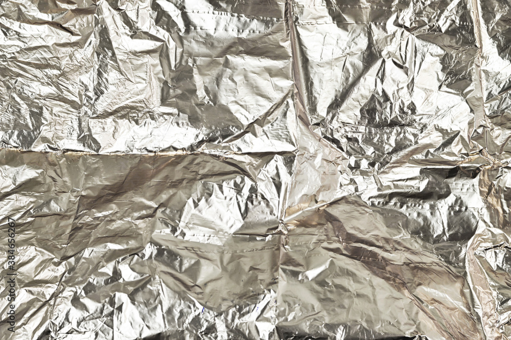 Shiny crumpled aluminum foil texture background. Shiny silver surface