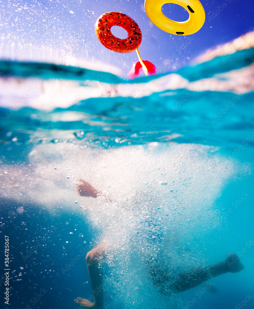 Split photo of a child dive in the water of swim pool with bubbles splashes and flying inflatable doughnut