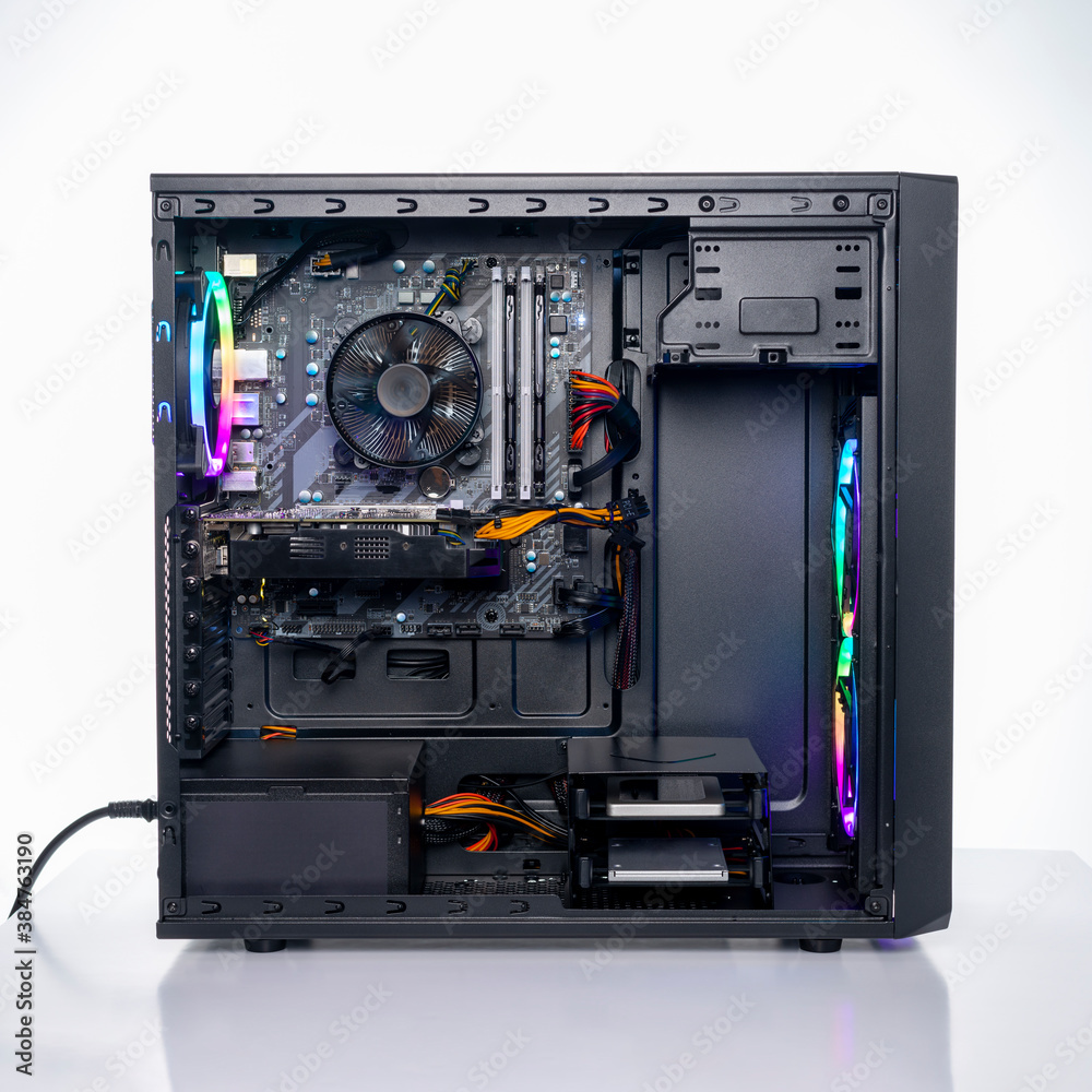 Studio shot of black Gaming desktop pc with rgb lights and visible components. Isolated on white background.