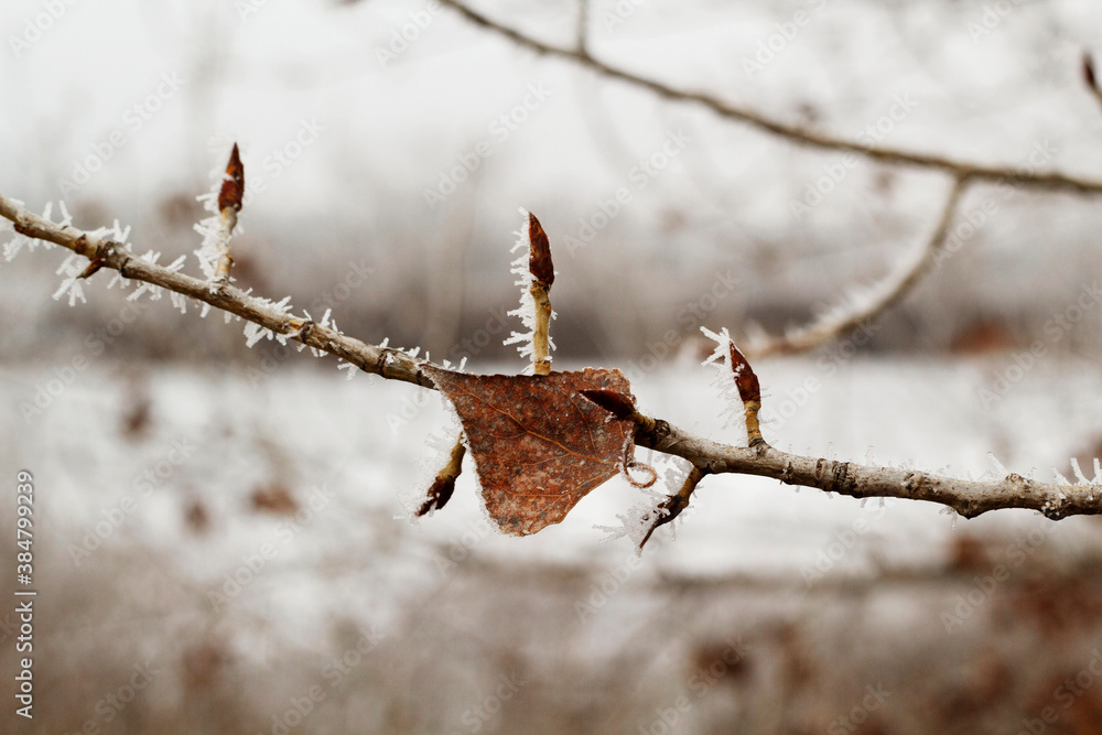 Picture of bright white winter landscape with frozen leaf of poplar tree close up