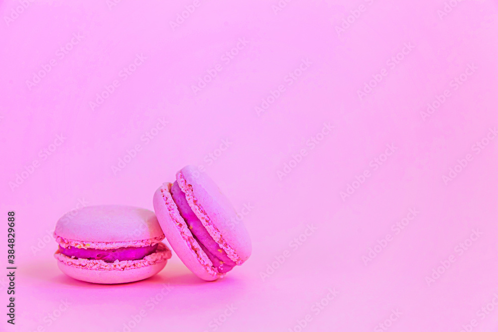 Sweet almond colorful unicorn pink macaron or macaroon dessert cake isolated on trendy pink pastel background. French sweet cookie. Minimal food bakery concept Copy space