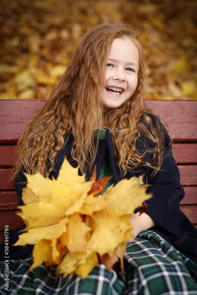 Irish little red haired girl laughing outdoor photo on fall landscape backgroun