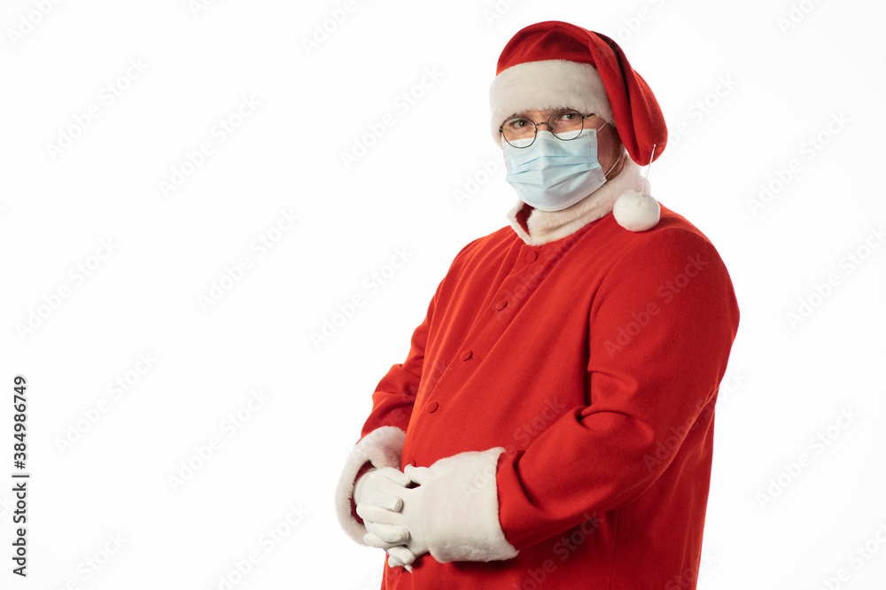 Santa Claus in a medical mask on a white background.