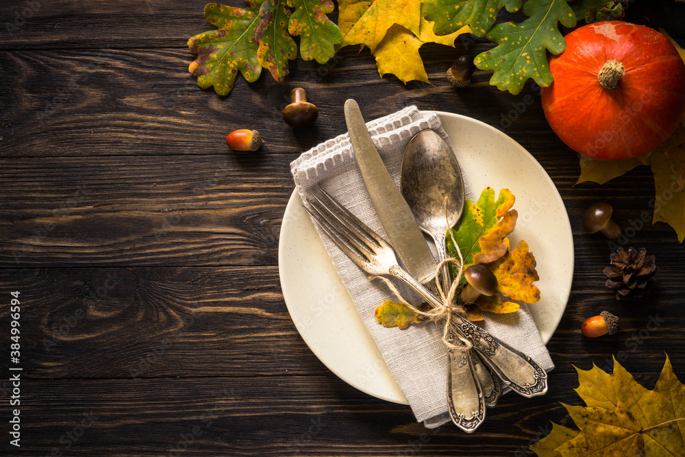 Autumn table setting top view.