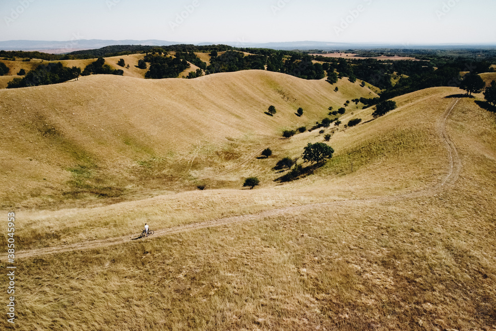 Mountain bike rider in the Zagajica Hills, sandy terrain of Deliblato Sands. Looking backward