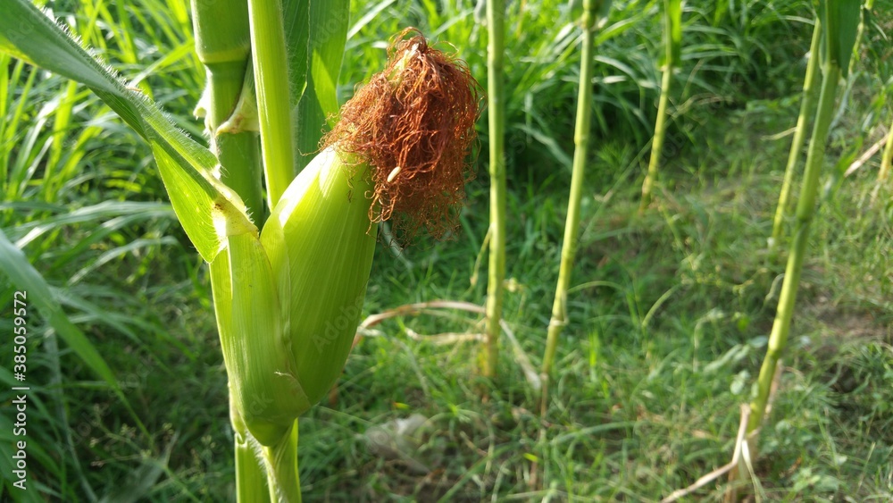 Young green corn that has grown and is ready to harvest in the green corn field in the garden near the residential area in the morning