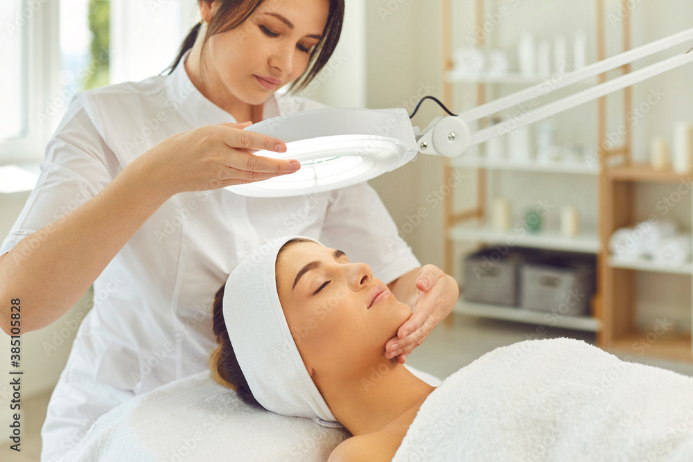 Woman cosmetologist looking at serene young womans face anc checking skin condition