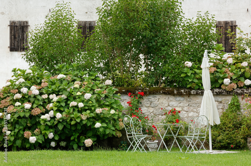 Lovely corner of a garden, with a small table, chairs and a parasol