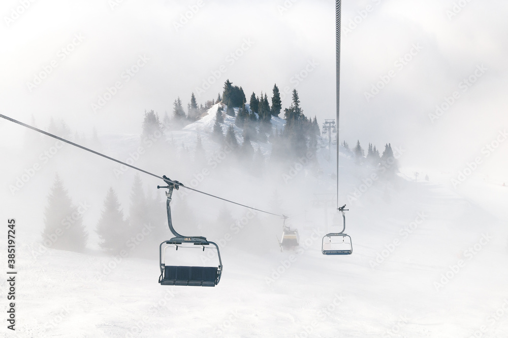 Ski lift on the background of mountains in the fog. Beautiful luxury best winter holiday background.