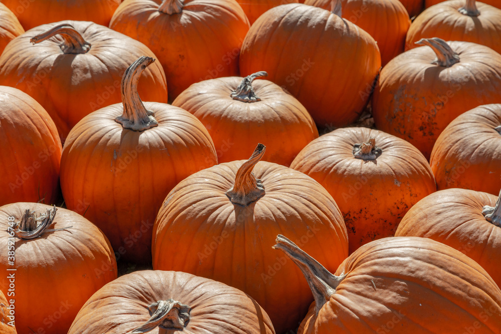 sehr viele orange Kürbisse liegen auf einem Haufen