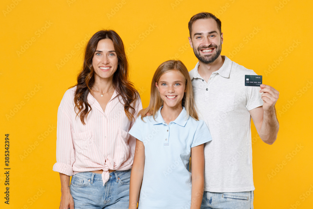 Cheerful smiling young parents mom dad with child kid daughter teen girl in basic t-shirts hold credit bank card isolated on yellow background studio portrait. Family day parenthood childhood concept.
