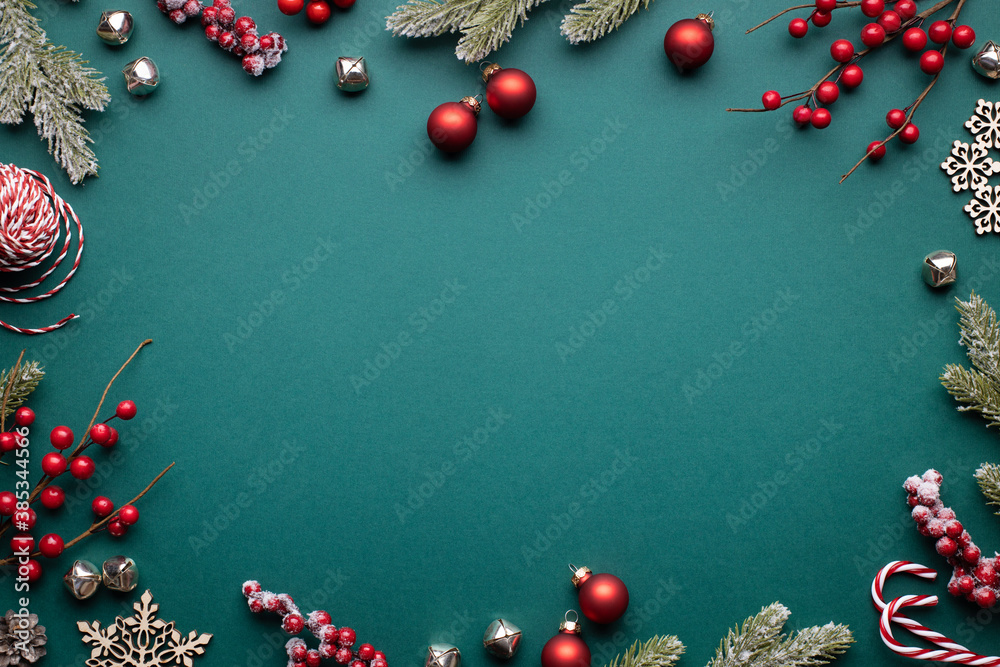 Christmas frame with classic red decorations. Fir branches, balls, jingle bells on green background.
