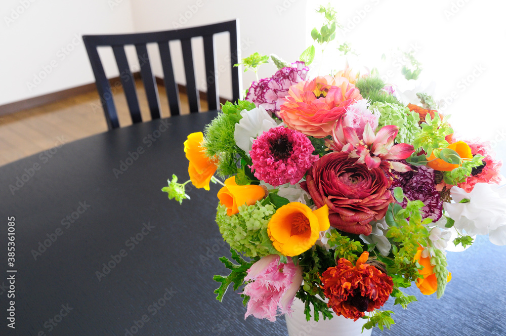 リビングルームテーブル上の花瓶に入れた春の花のフラワーアレンジメント
