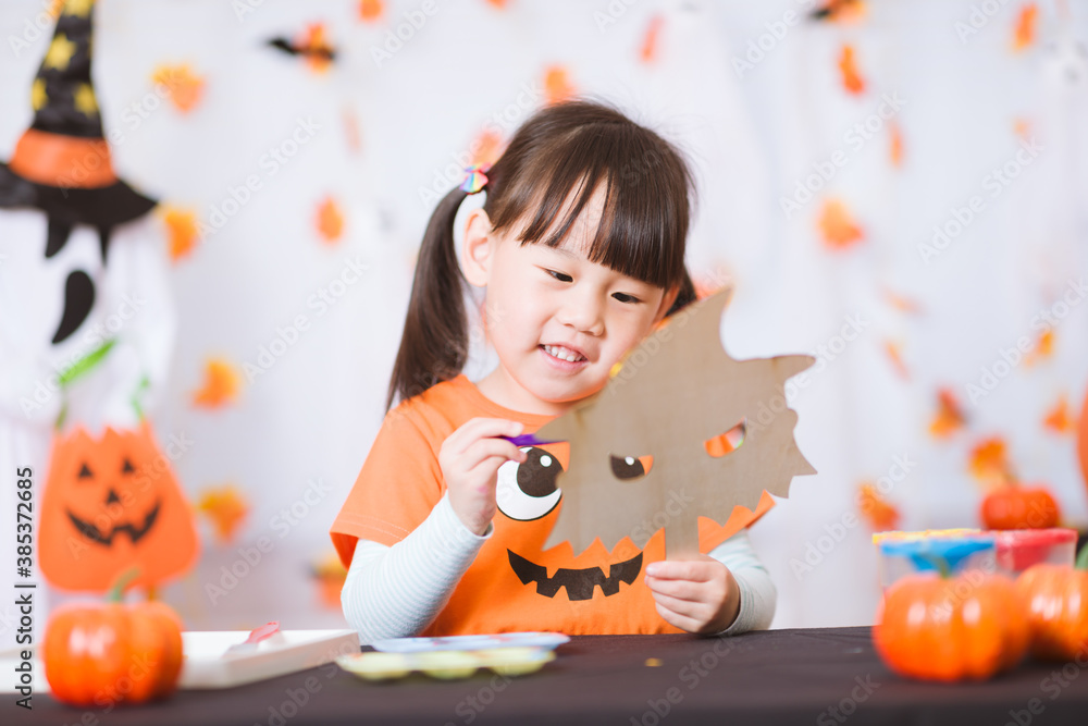 young girl painting witch mask for Halloween party at home
