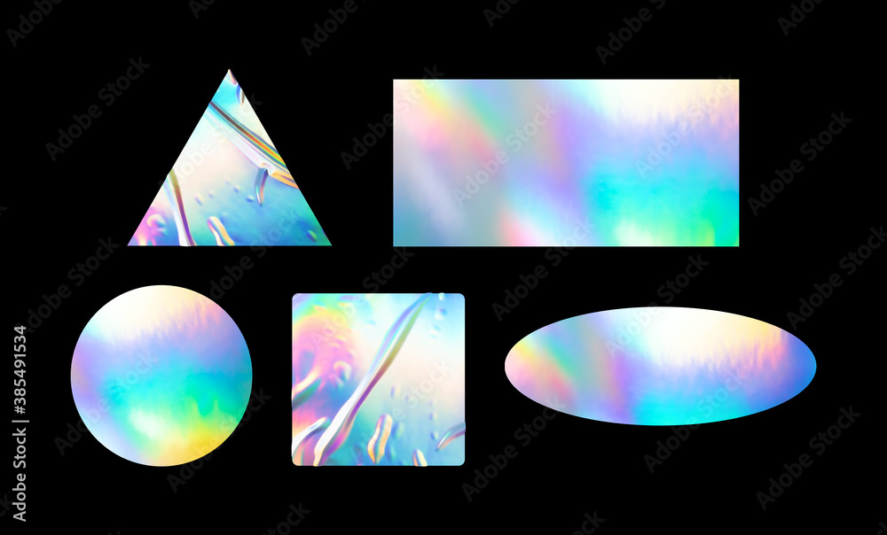 a variety of blank glued sticker shapes for design mockups. Holographic textured stickers for preview tags, labels, etc.