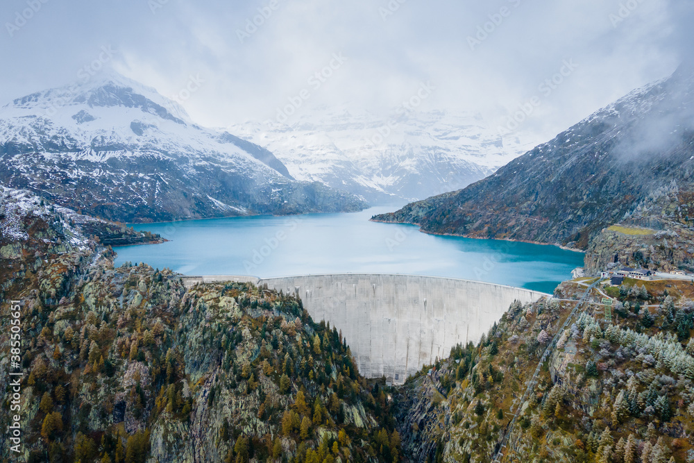 Hydropower generated from arch dam and reservoir lake in snow covered Swiss Alps mountains to produce renewable energy, sustainable hydroelectricity, aerial drone view, cold autumn weather