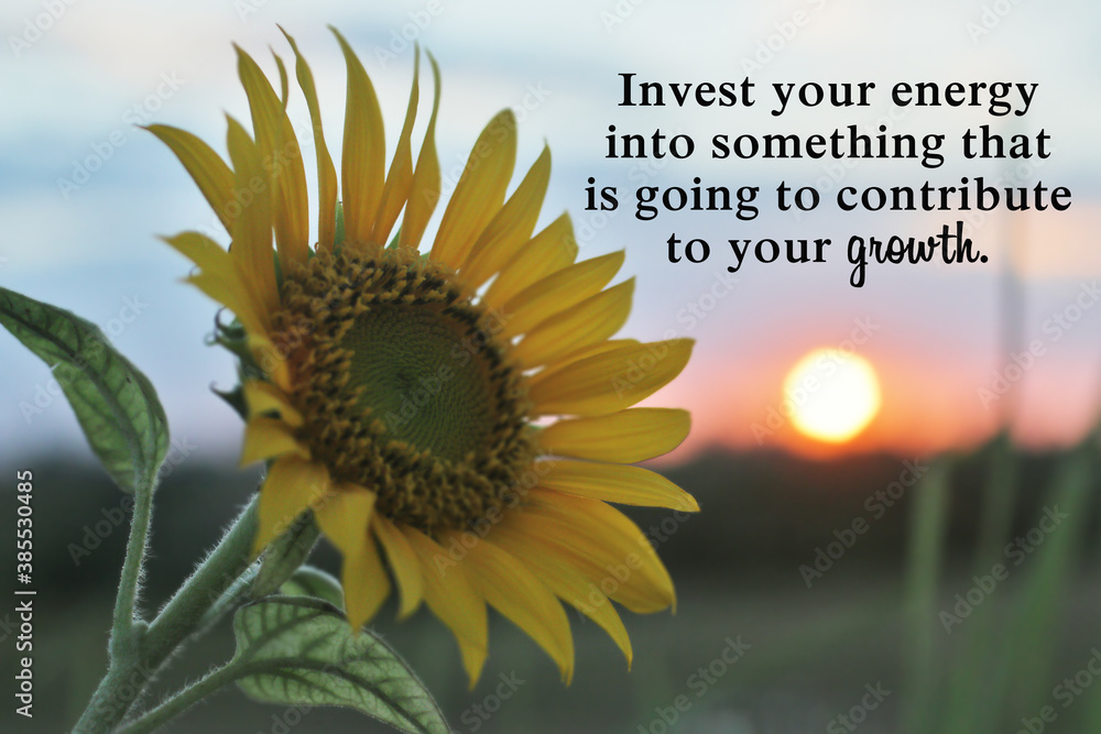 Motivational words - Invest your energy into something that is going to contribute to your growth. Positive inspirational quote with the sun and sunflower in the garden at sunset sunrise background.