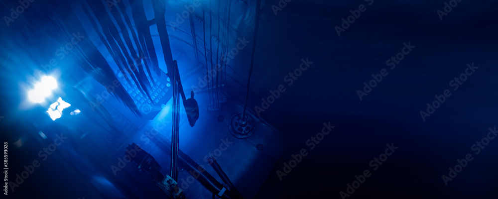 Banner Blue glow water of nuclear reactor core powered, caused by Cherenkov radiation, fuel plates industrial uran