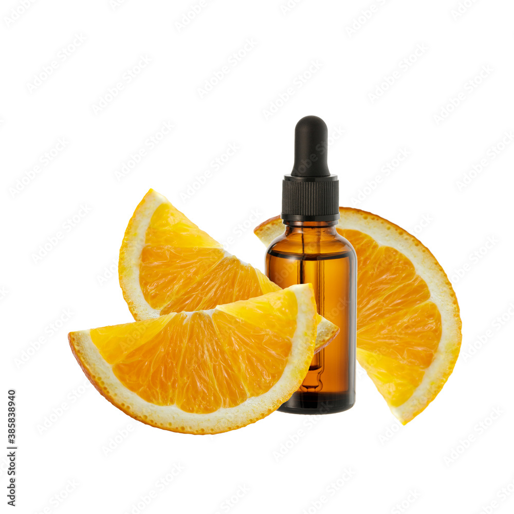 Dark brown glass bottle of face serum with vitamin C or essential oil and orange slices