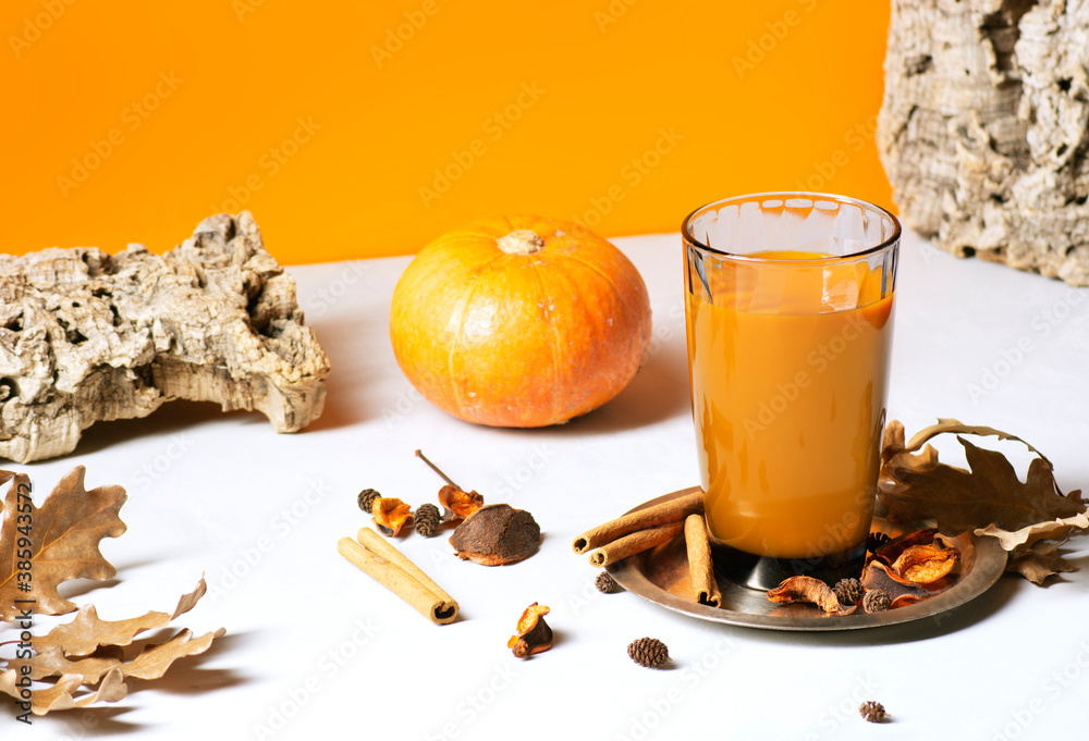 A pumpkin smoothie on an orange background stands on a metal plate, next to it lies a pumpkin, spices and tree bark.
