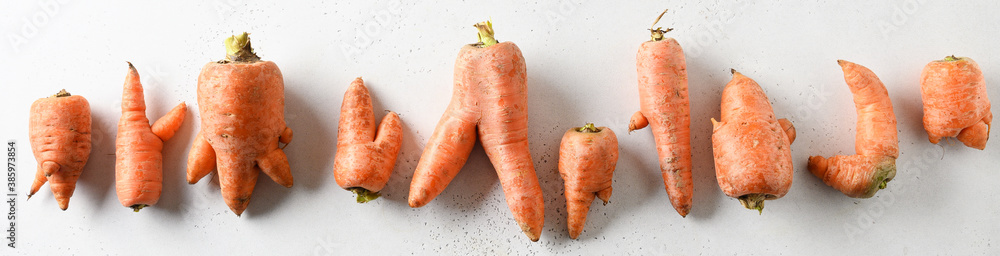 Banner of abnormal ugly organic carrots on white. Natural vegetables.