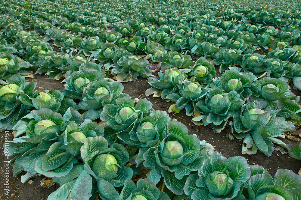 Rows of ripe green cabbage before harvesting in a farmer's field