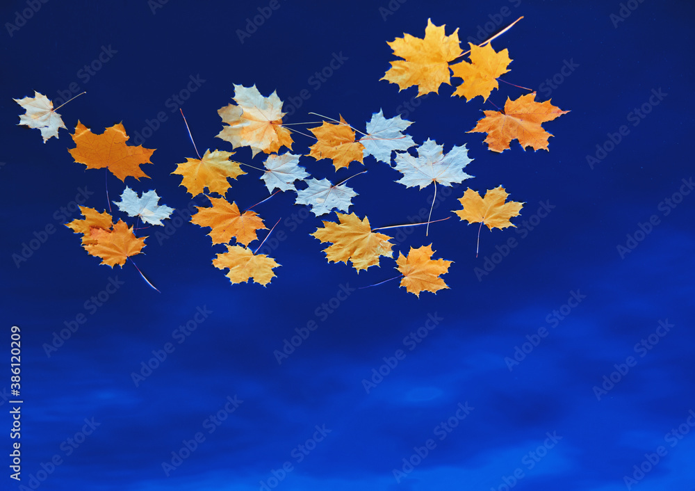 Fallen autumn yellow maple leaves on the surface of blue water. Space for your text