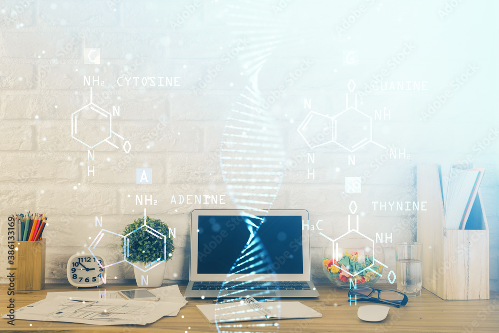 Desktop computer background and DNA drawing. Double exposure. Science concept.