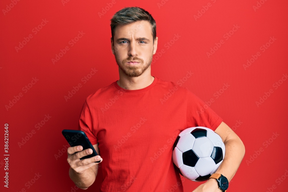 Handsome caucasian man holding football ball looking at smartphone puffing cheeks with funny face. mouth inflated with air, catching air.