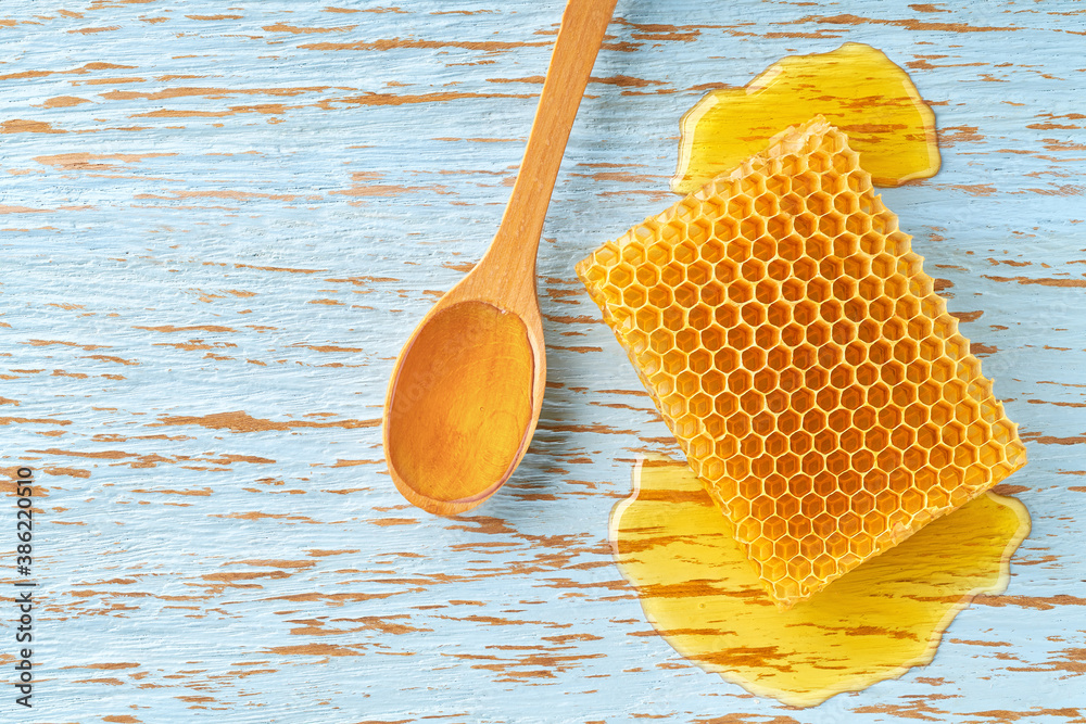 honeycombs from a bee hive filled with golden honey on blue table, top view.