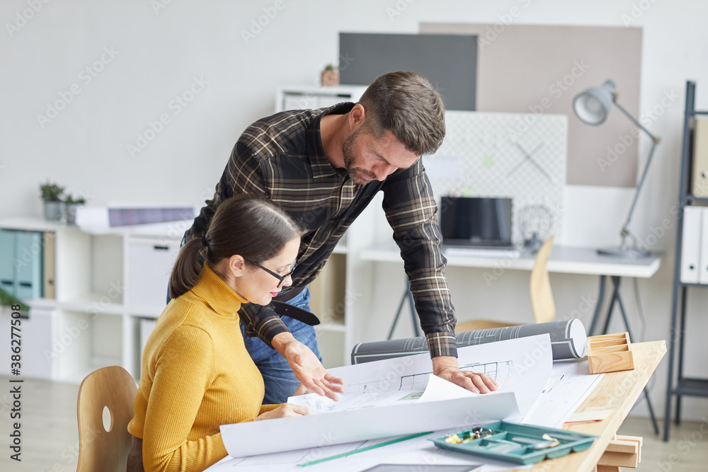 Side view portrait of two architects collaborating on blueprints while working in office together, copy space