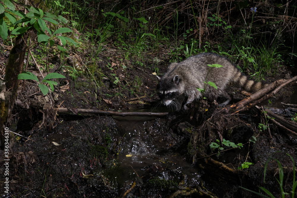 Night Hunter - Raccoon (Procyon lotor) searching for food at night along a small stream.