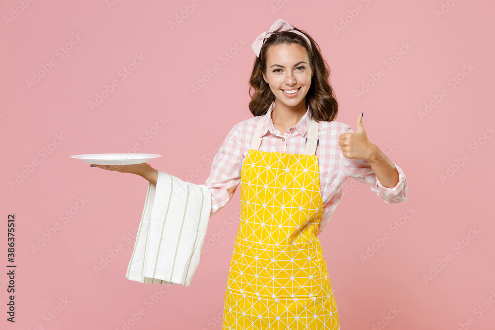 Cheerful smiling young woman housewife 20s in yellow apron hold empty plate dishcloth towel showing thumb up doing housework isolated on pastel pink background studio portrait. Housekeeping concept.