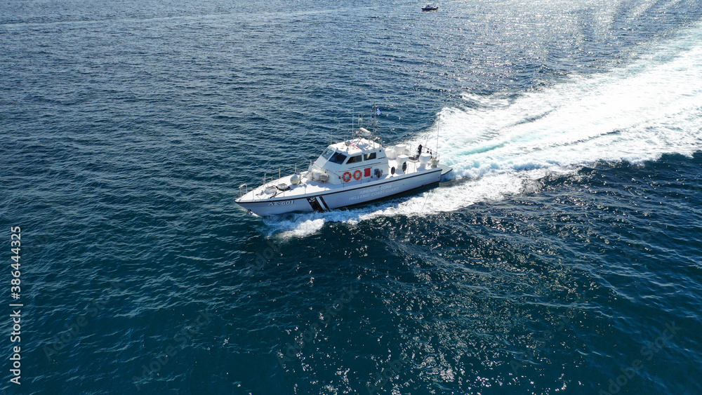 Aerial drone ultra wide photo of Hellenic Coast guard powerboat cruising in high speed near port of Piraeus, Attica, Greece