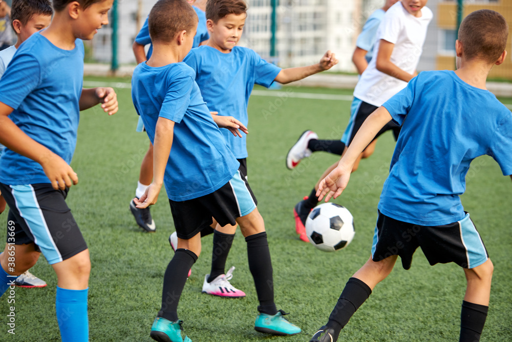 young caucasian school kids playing football in a field, stadium. boys 8-9 years old kicking soccer on the sports grass pitch, wearing sportswear on football match