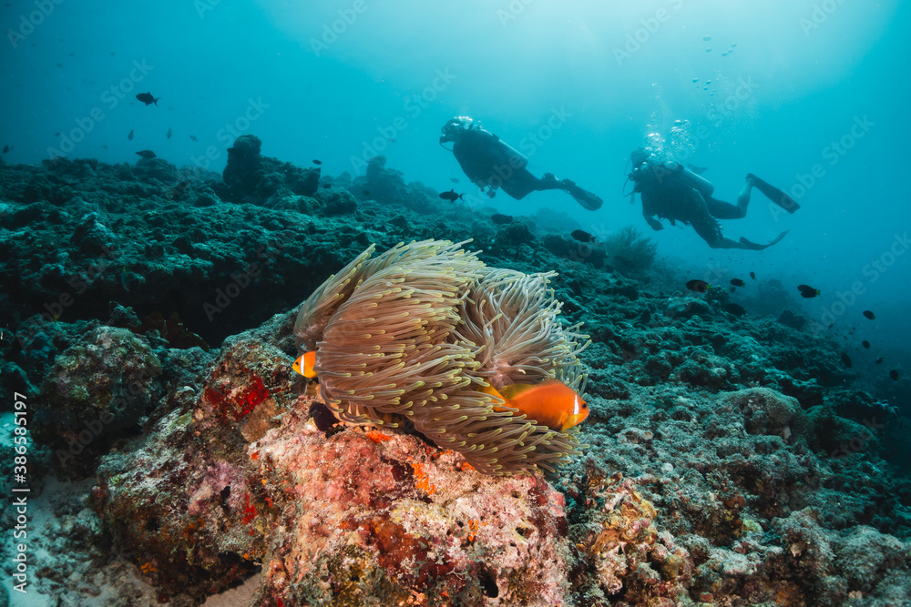 Scuba diver silhouettes swimming over colorful clown anemone fish in blue ocean