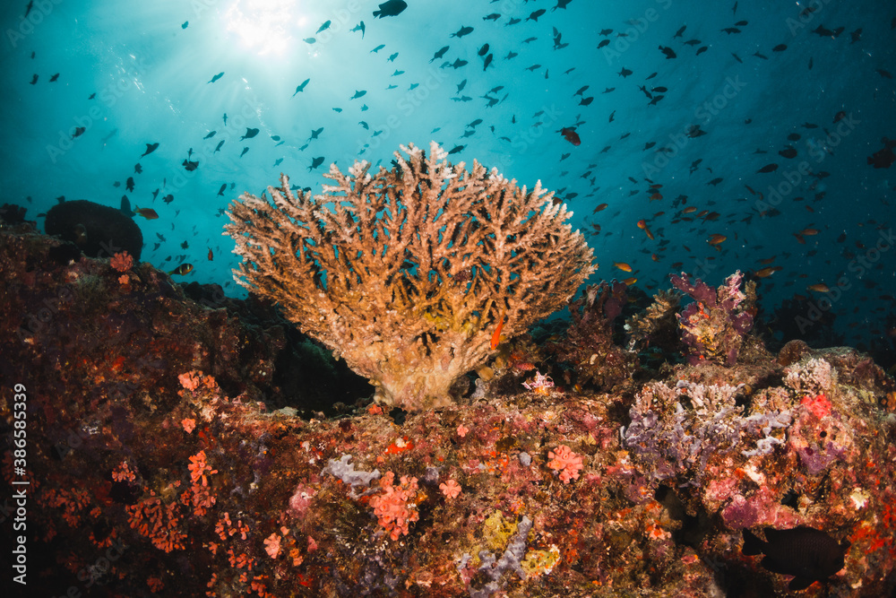 Colorful coral reef in tropical scene surrounded by fish