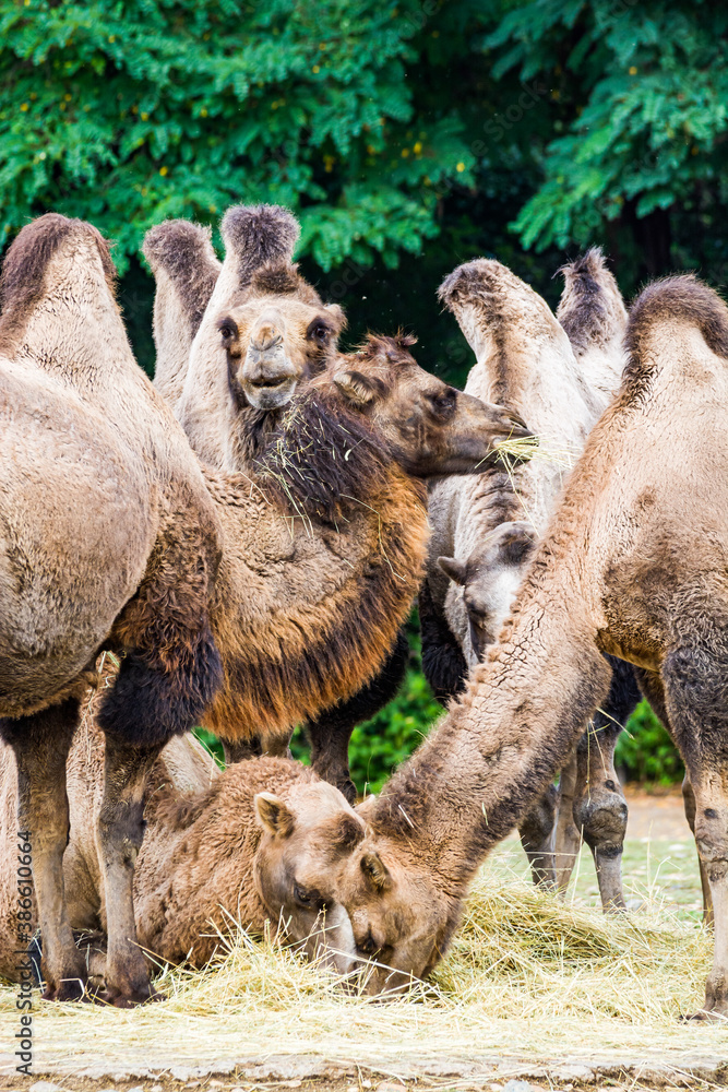 Group of Bactrian camels living in zoological garden