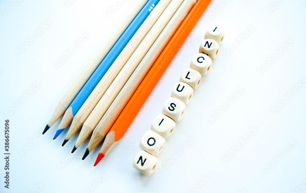 Inclusion text of cubes on white background. Lettering.Diversity and inclusion social concept.