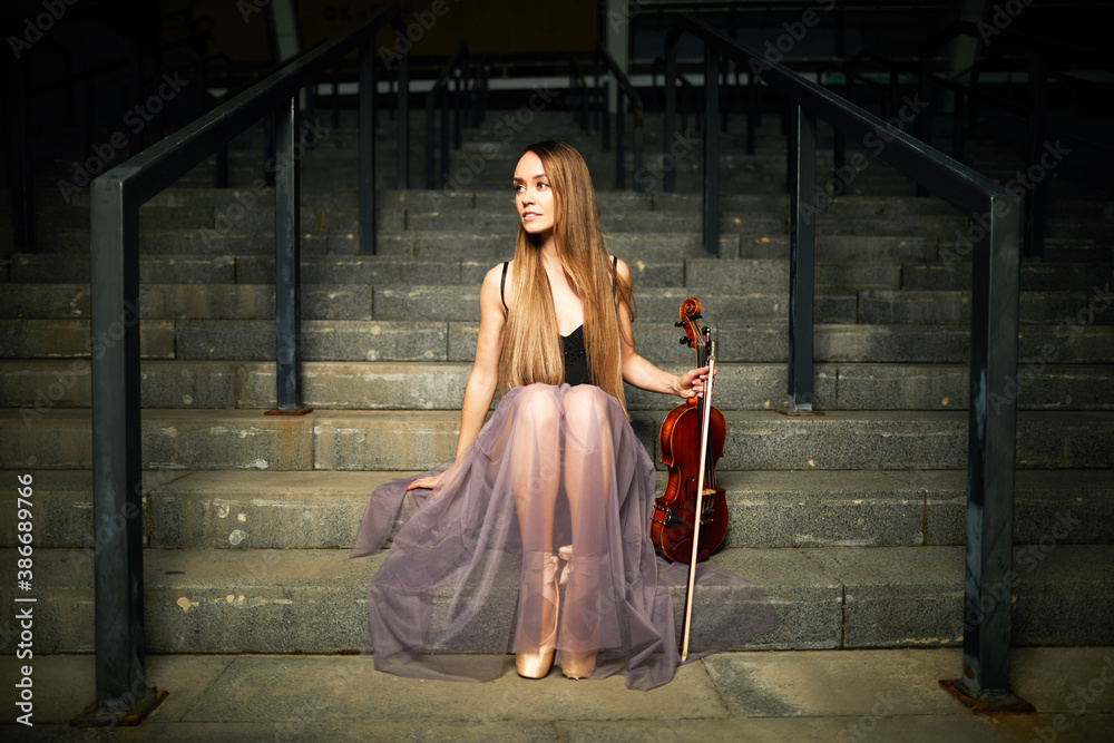 A beautiful adult woman with long hair posing with violin on pointe shoes outdoors in city.