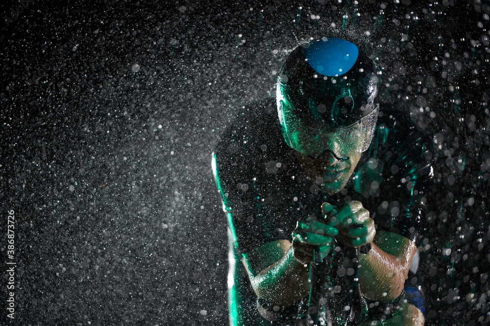 triathlon athlete riding bike fast on rainy night