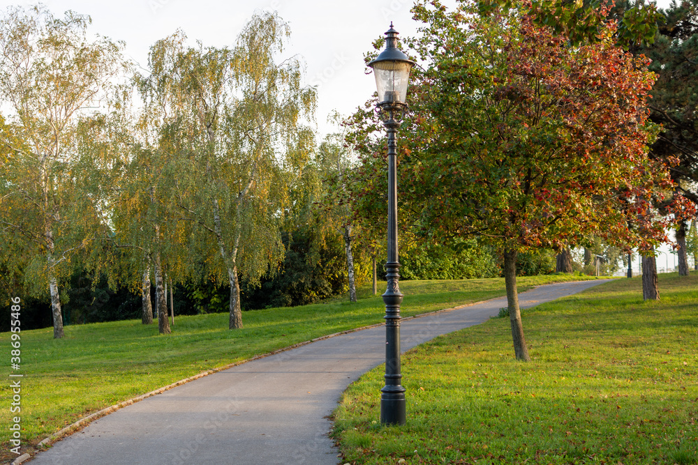 Autumn landscape. The autumn tree leaves with a pathway in the public park.