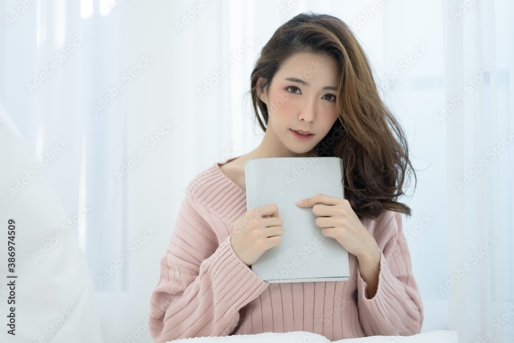 Young beautiful Asian girl cozy on a bed holding a book and looking at camera, reading a book, the concept of comfort and hipster.