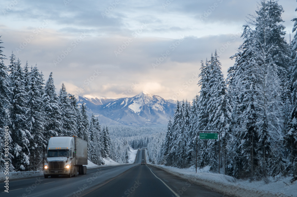 Truck driving through the rocky mountains in winter on the Trans Canada Highway in British Columbia near Rogers pass with good road conditions snowy winter mountain landscape scenery as backdrop
