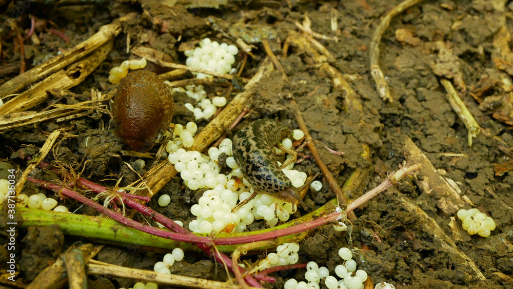 Spanish slug eggs nest hatchery hatch pest Arion vulgaris Limax maximus biggest great grey leopard slug egg-laying white laying snail parasitizes garden, eating plant crops. Invasive Spain parasitizes