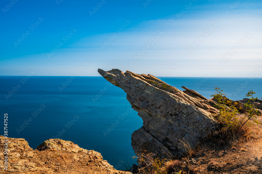 Panorama of a picturesque rock ledge above the sea against the sky. The concept of liberation and freedom.