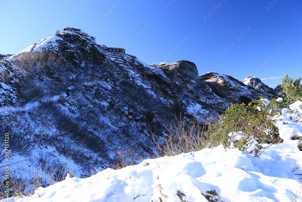 北アルプス燕岳への道 初冠雪 合戦尾根登山道から燕山荘、燕岳山頂を仰ぎ見る