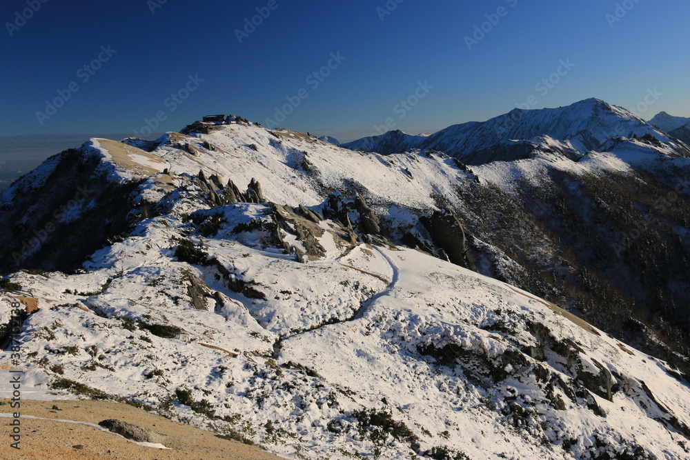 北アルプス燕岳から 夕陽に映える初冠雪の表銀座コース 燕山荘 大天井岳、常念岳遠景