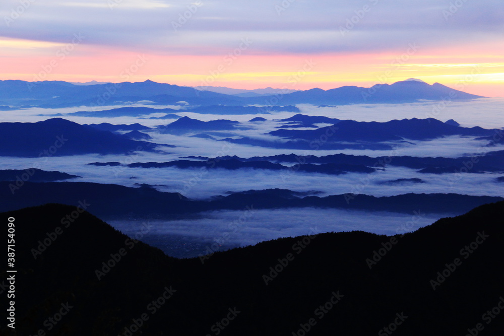 北アルプスの朝 燕岳からの風景 朝焼けと雲海と浅間山、四阿山遠景