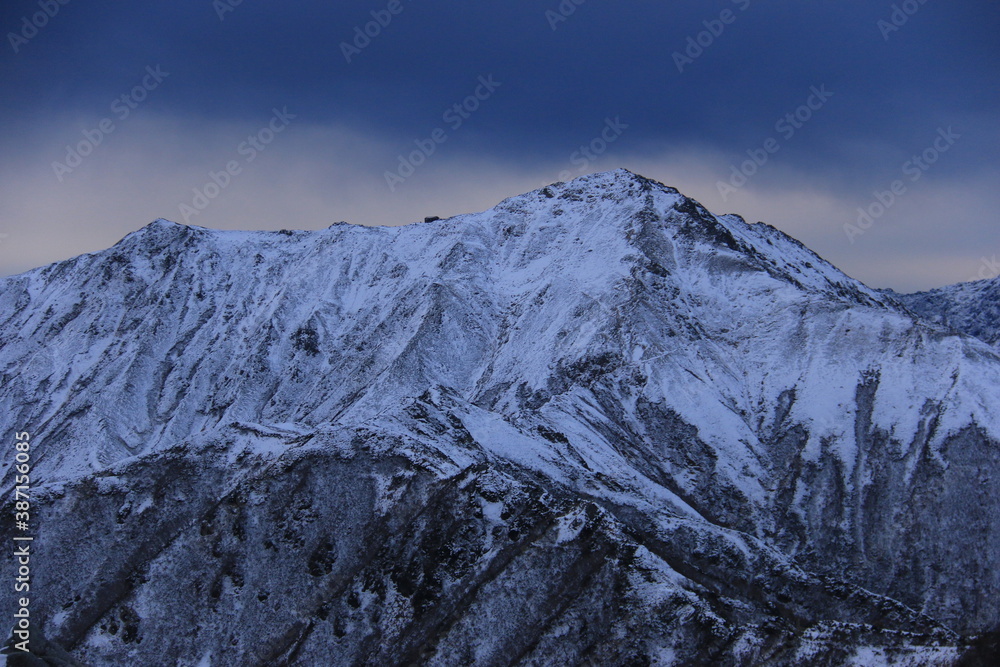 北アルプス燕岳 冬の朝 燕山荘からの風景 初冠雪の凍る大天井岳